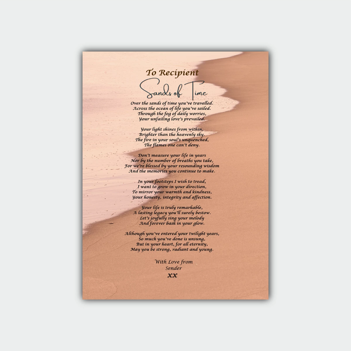 SANDS OF TIME | POETRY PRINT | ORIGINAL POEM 3 types of print options: Framed (Black & White), Canvas, or Aluminium Optional personalisation available at checkout. Categories: Birthday, Dad, Mum£49.99 Print Style Choose an optionBlack Framed PrintsWhite Framed PrintsCanvas PrintsAluminium PrintsClear Quantity Add to cart SKU: N/A A Poetry Print featuring an original poem, timeless verses that evoke reflection and contemplation. Can we interest you in… Something similar THANK YOU FOR BEING YOU | POETRY MUG | ORIGINAL POEMAdd to cart £19.99 QUITE EXCEPTIONAL | POETRY MUG | ORIGINAL POEMAdd to cart £19.99 NO ORDINARY WOMAN | POETRY PRINT | ORIGINAL POEMSelect options This product has multiple variants. The options may be chosen on the product page £49.99